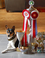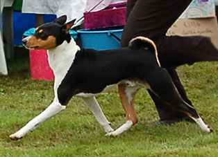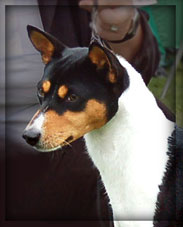 | Good size of a tricolor young male. Powerful head, correct bite. Light eye. Good neck and back, slightly rounded croup. Correct quarters. Good feet. Moves well. |